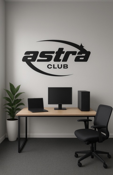 La oficina de Astra Club presenta un diseño moderno y minimalista. Destaca el logotipo negro sobre una pared gris clara, acompañado de mobiliario de madera y metal en tonos neutros. El espacio, iluminado por luz natural y decorado con una planta, transmite profesionalidad, orden y equilibrio.